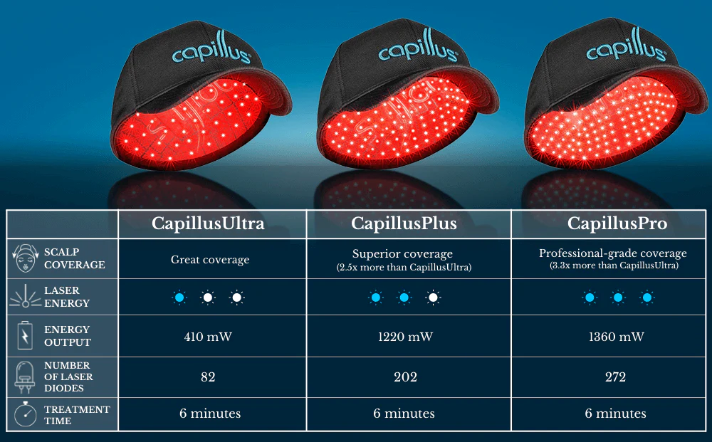 The biggest difference between each cap is the number of laser diodes. The more diodes in a Capillus Laser Cap, the denser its scalp coverage. More hair follicles are targeted, helping achieve denser, fuller therapeutic treatments and better results over time.